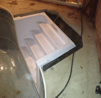Un escalier en acrylique supporté par du fibre de verre qui délamine sur une grande surface (plastique qui décolle du fibre de verre d’origine).